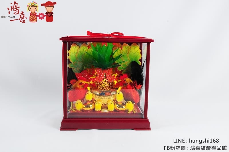 玻璃框裝,歸寧時娘家準備帶路雞,甘蔗,米糕豆,回禮桃,帶到夫家有祝福"起家"之意